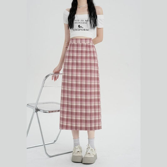 Skirt H-Line Slit Plaid Midi Waist High