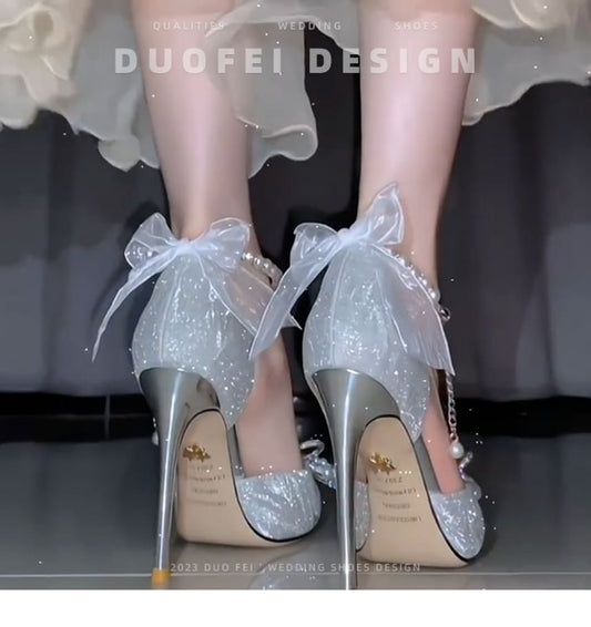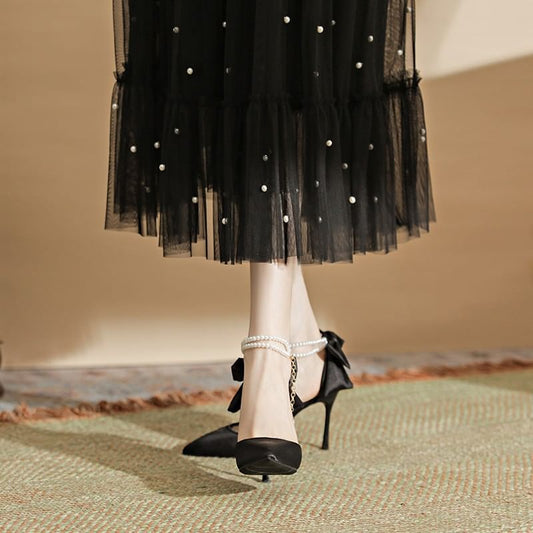 Glitter Bow Faux Pearl Ankle Strap Stiletto Sandals