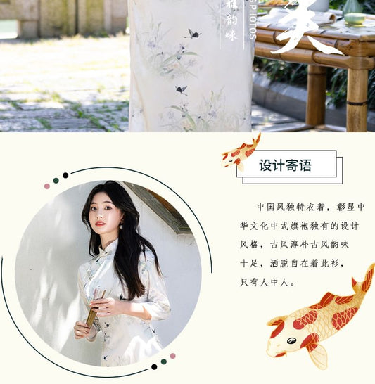 3/4 Sleeve Floral Butterfly Print Midi Sheath Qipao