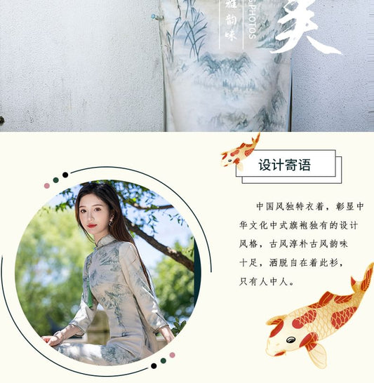 3/4 Sleeve Floral Print Midi Sheath Qipao