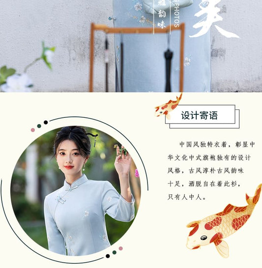 3/4 Sleeve Bamboo Embroidered Midi Sheath Qipao