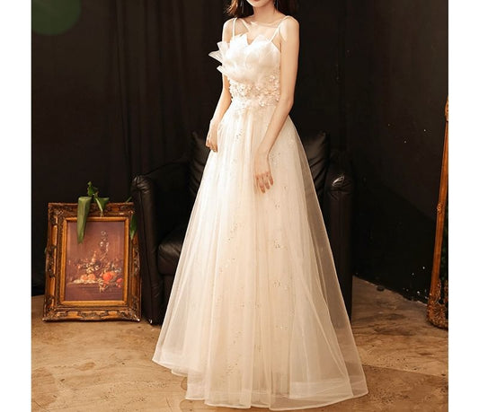 Spaghetti Strap Notch Neck Sequin Floral Accent Mesh A-Line Evening Gown