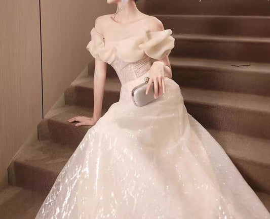 Short-Sleeve Off-Shoulder Sequin Ruched A-Line Evening Gown