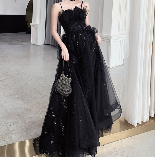Spaghetti Strap V-Neck Plain Sequin A-Line Evening Dress
