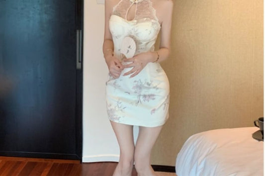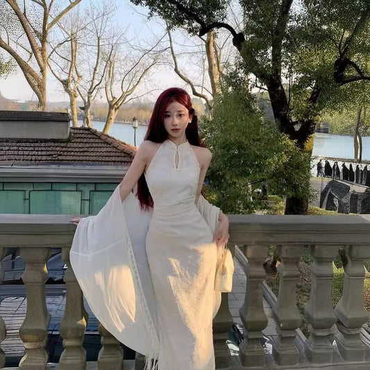 Set: Halter Neck Stand Collar Floral Jacquard Ruched Frog Buttoned Midi Sheath Qipao + Plain Fringed Open Front Long Light Jacket