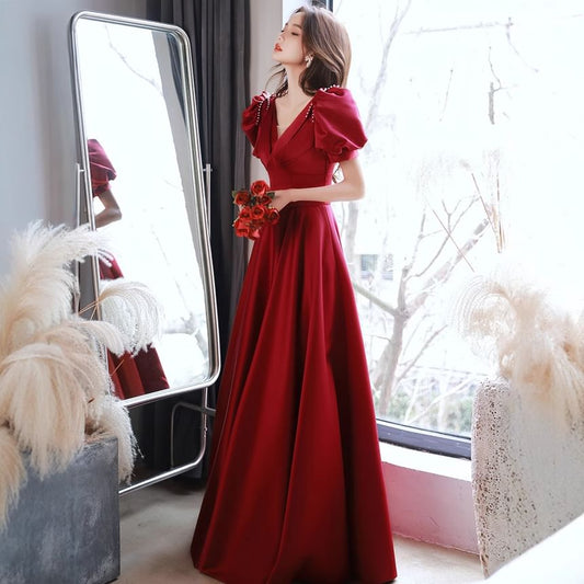 Short Puff Sleeve V-Neck Beaded Bow Mesh Panel Satin A-Line Evening Gown