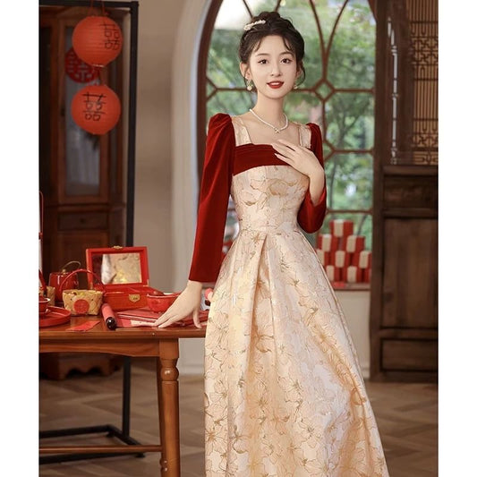 Long Sleeve Square Neck Velvet Panel Jacquard A-Line Evening Gown