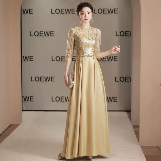 Elbow Sleeve Round Neck Sequin Panel Mesh A-Line Evening Gown