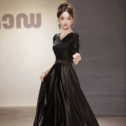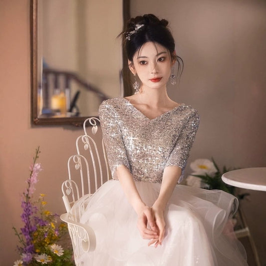 Elbow Sleeve V-Neck Plain Sequin Satin A-Line Evening Gown