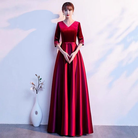Elbow Sleeve V-Neck Plain Velvet Panel Satin A-Line Evening Gown