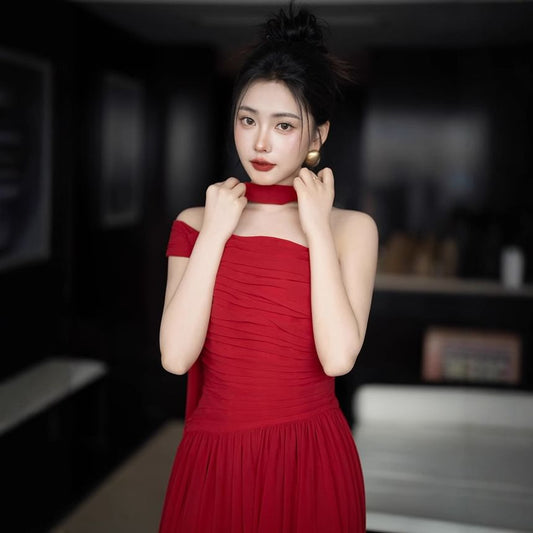 Halter Neck Plain Ruffle Trim Party Dress