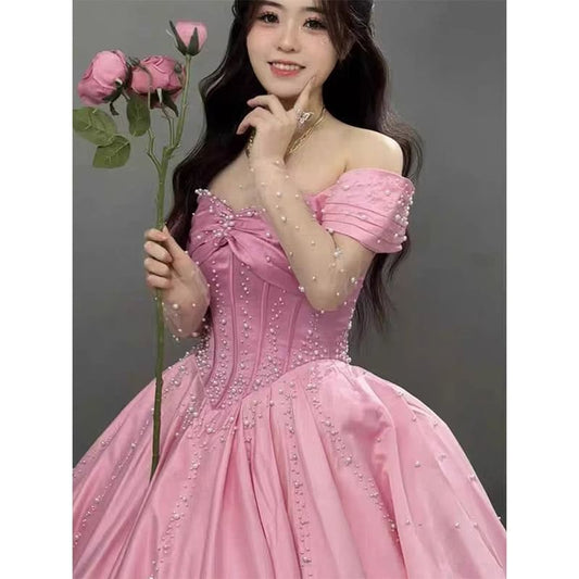 Short-Sleeve Off Shoulder Rhinestone A-Line Evening Gown