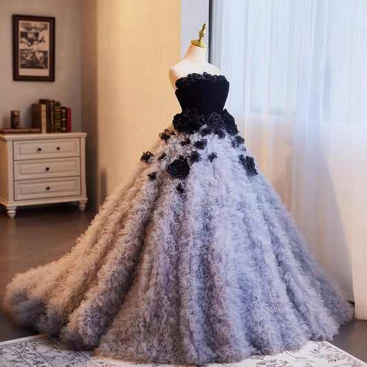 Strapless Flower Detail A-Line Evening Gown