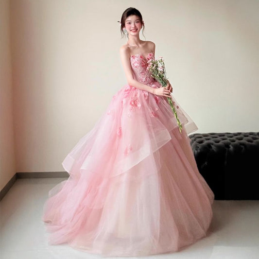 Strapless Plain Tiered Trained A-Line Evening Gown