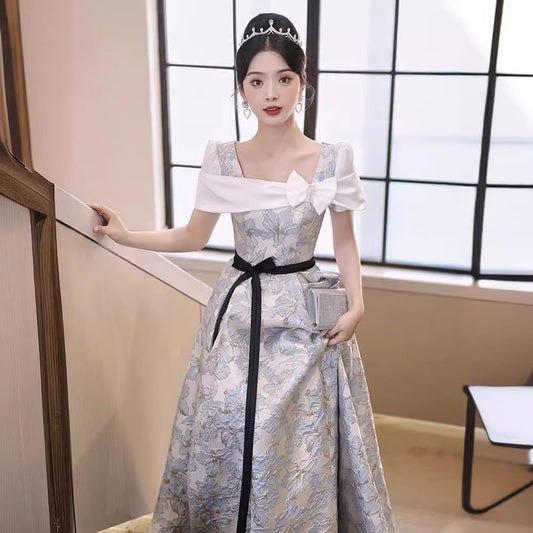 Short Sleeve Square Neck Bow Panel Jacquard A-Line Evening Gown