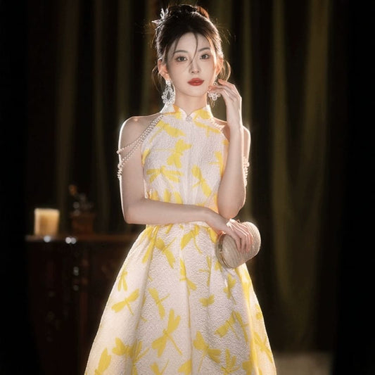 Sleeveless Mandarin Collar Dragonfly Print Faux Pearl Strand A-Line Evening Gown