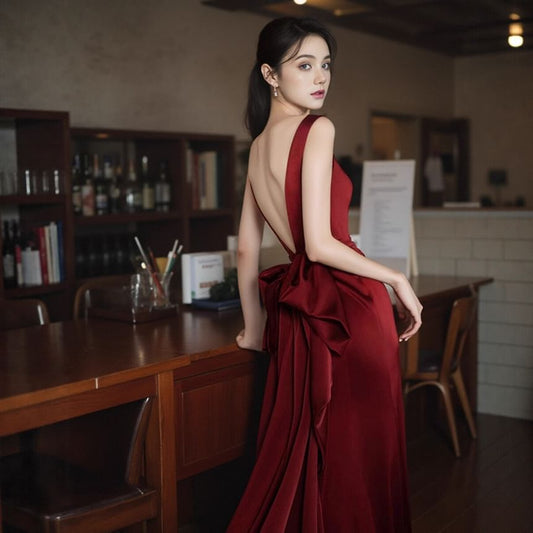 Sleeveless V-Neck Plain Bow Backless Trumpet Evening Gown