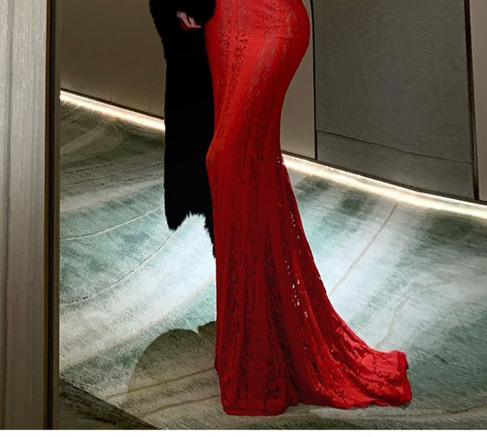 Long-Sleeve Off-Shoulder Lace Mermaid Evening Gown