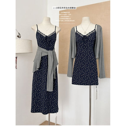 Set: Spaghetti Strap V-Neck Floral Print Lace Trim A-Line Dress + Plain Open Front Cardigan (Various Designs)