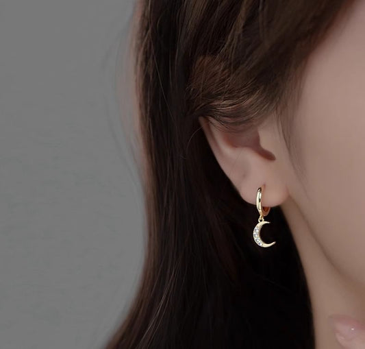 Moon & Star Rhinestone Asymmetrical Sterling Silver Drop Earring