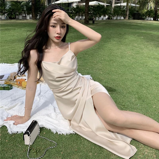 Spaghetti Strap Cowl Neck Plain Open Back Satin Midi A-Line Dress