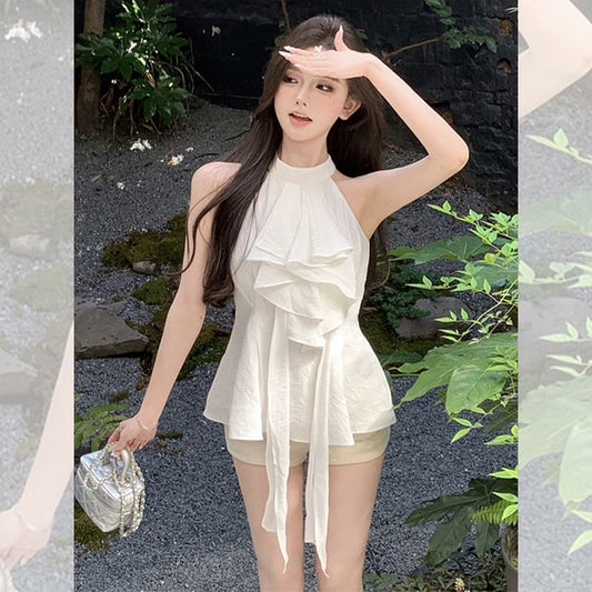 Set: Short Sleeve Cold-Shoulder Plain Asymmetric-Hem Slim-Fit Top + High Rise Loose-Fit Pants