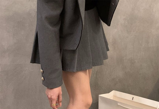 Long-Sleeve Plain Crop Top / Striped Shirt / High Waist Maxi A-Line Pleated Skirt / Set