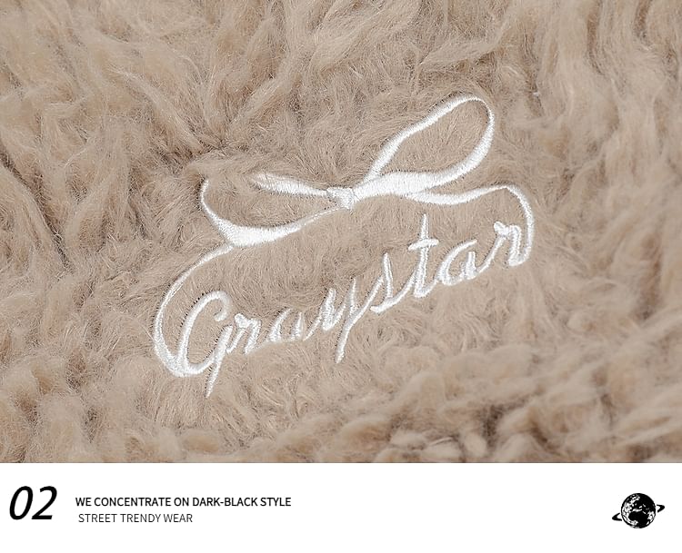 Bow Embroidered Rabbit Ear Hooded Fluffy Zip Jacket