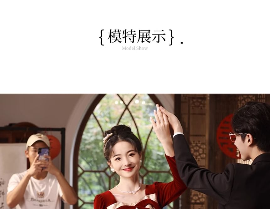 Bow Velvet Evening Gown A-Line Long-Sleeve
