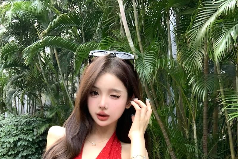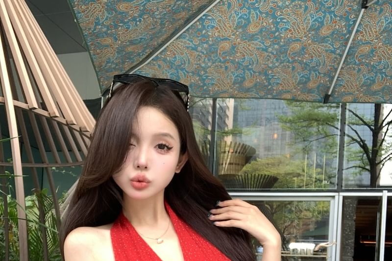 Halter-Neck Plain Ruffle Hem Dotted Top