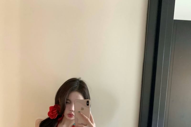 Dotted Plain Top Halter-Neck Hem Ruffle