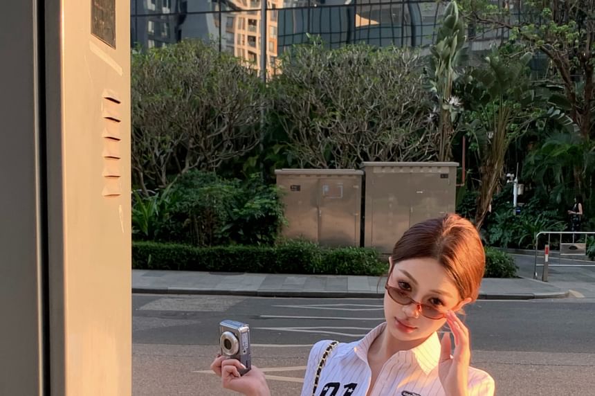 Elbow-Sleeve Numbering Striped Button-Up Shirt