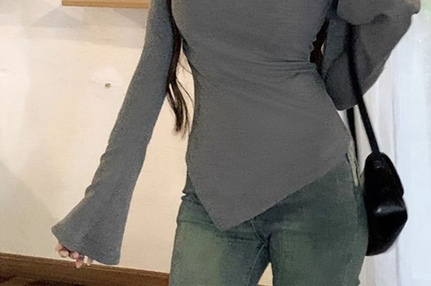 Flared-Sleeve Off-Shoulder Plain Asymmetrical Tee