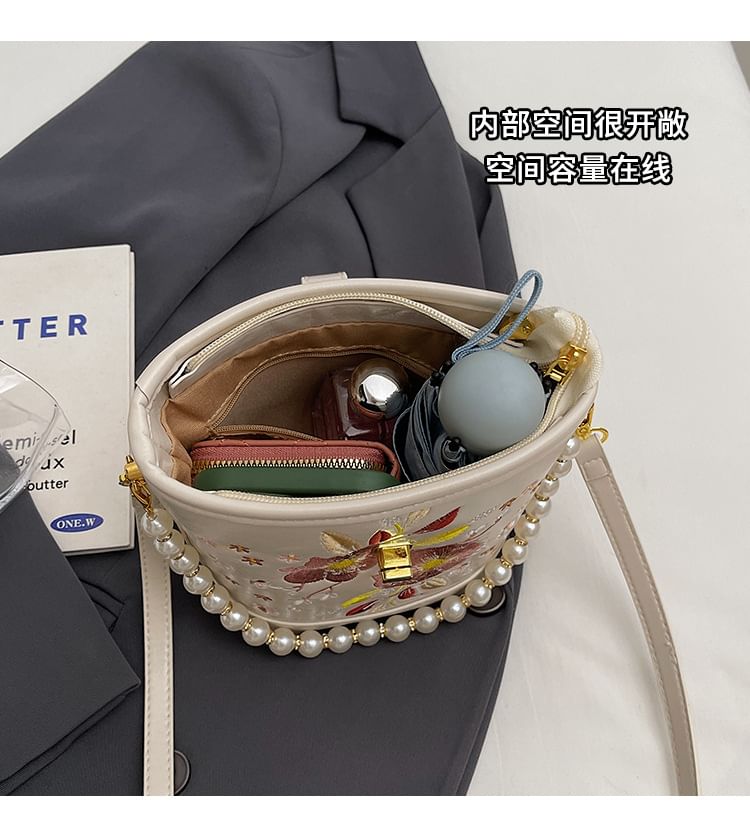 Floral Embroidered Faux Pearl Strap Bucket Bag