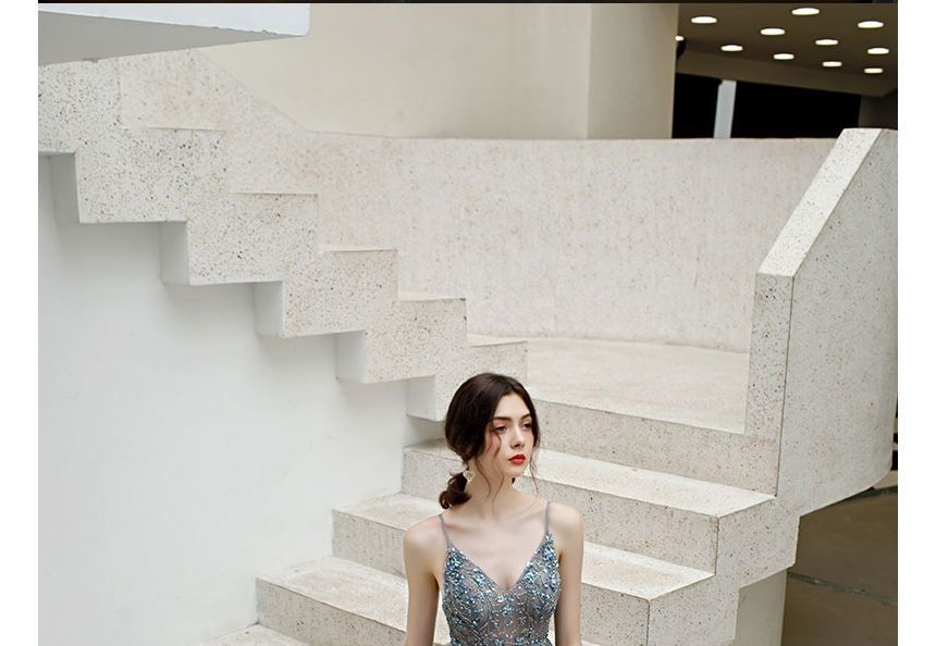 Spaghetti Strap Rhinestone Floral A-Line Evening Gown