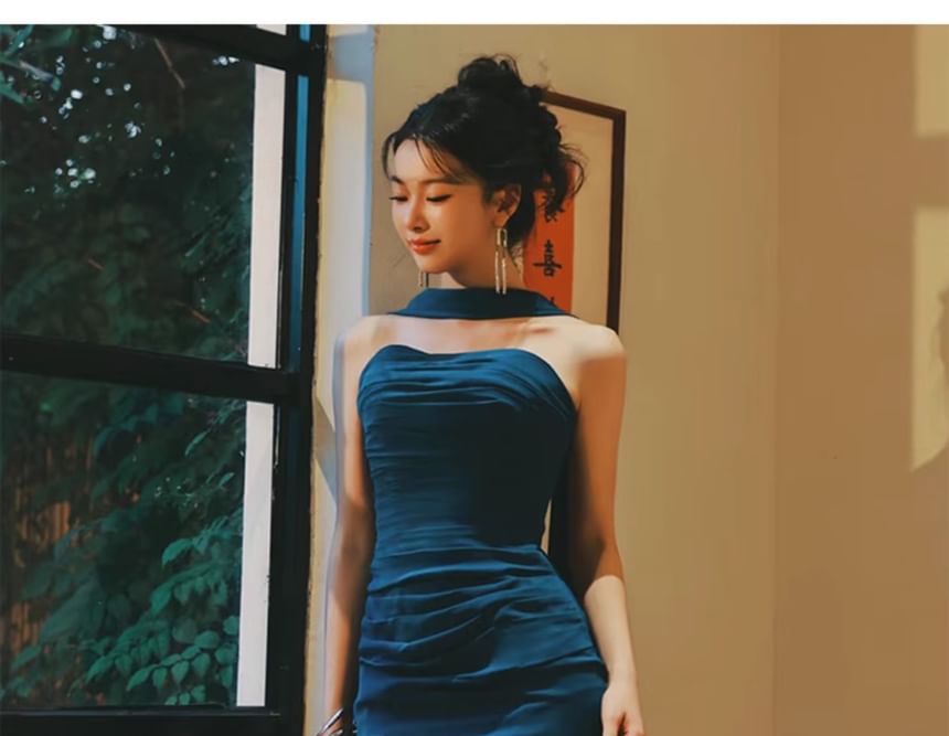 Halter Neck Plain Ruched Mermaid Evening Gown