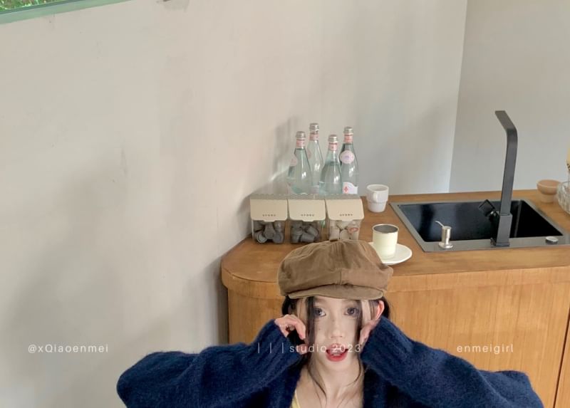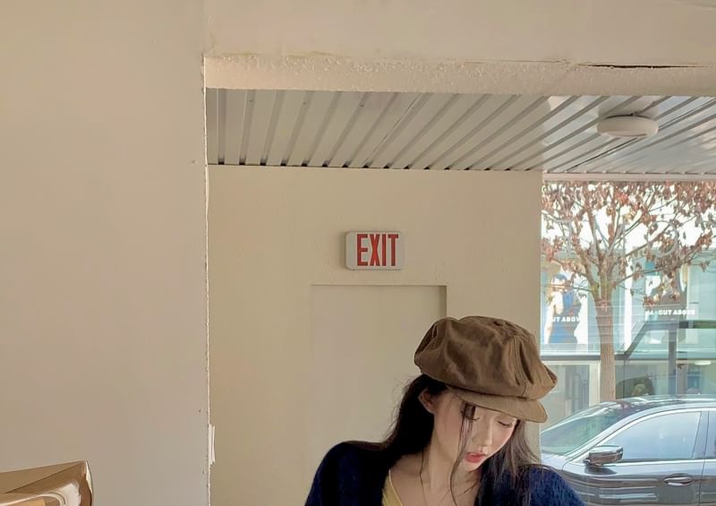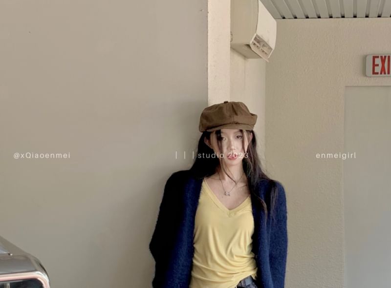 Long Sleeve V-Neck Plain Tee / Plain Long Cardigan / Mid Waist Plaid Mini Pleated Skirt