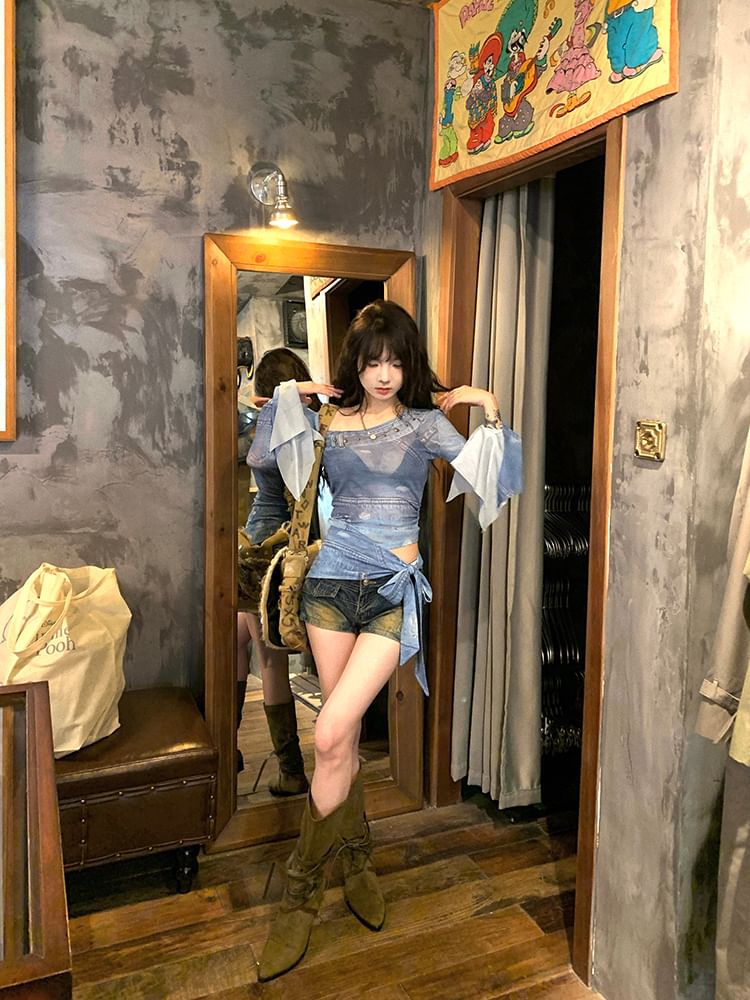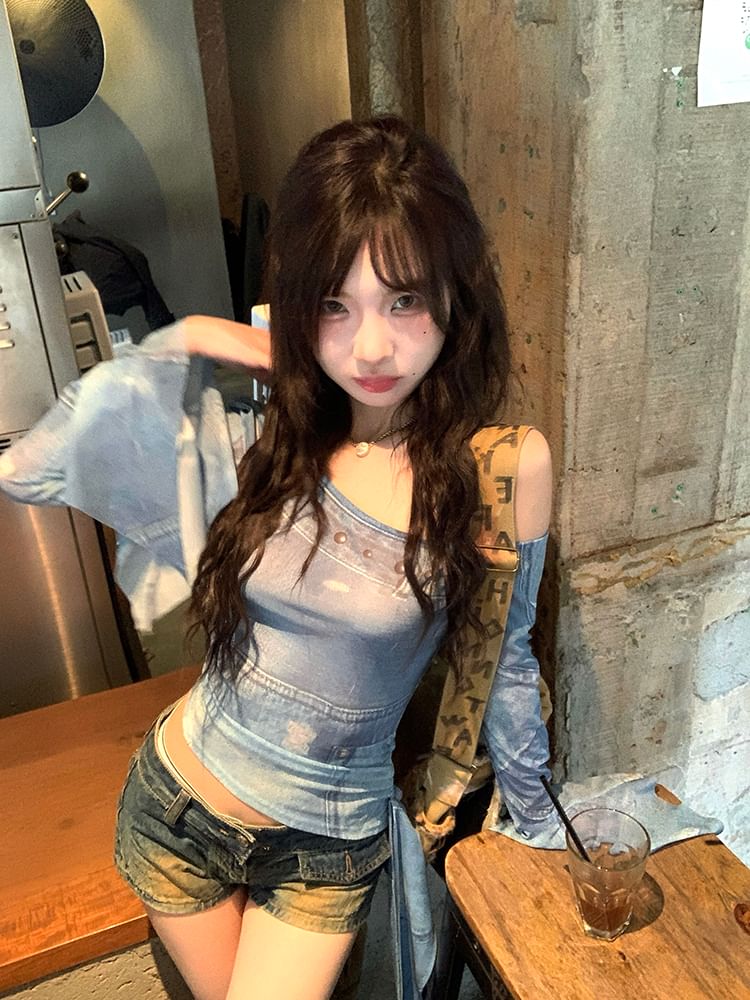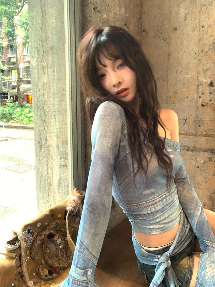 Long-Sleeve Asymmetrical Neck Print Crop Slim Fit Tee