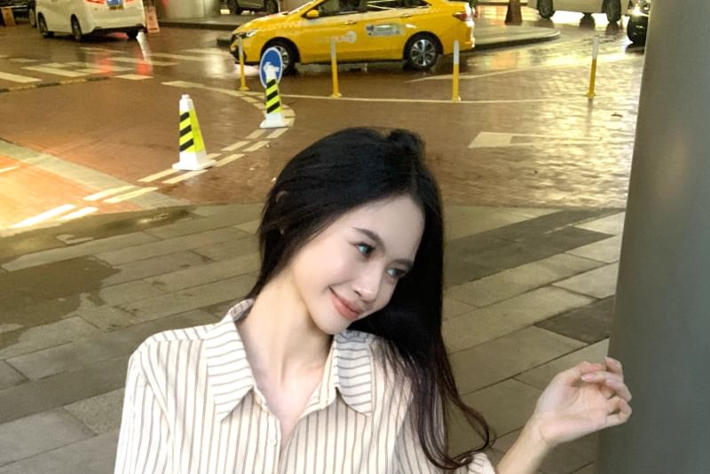 Long-Sleeve Collared Striped Button Up Shirt / High Waist Leopard Print Mini Pencil Skirt
