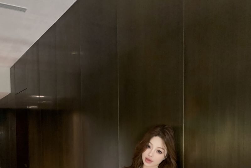 Long-Sleeve Flower Embroidered Shirt / High Rise Ruched Bow Mini Pencil Skirt