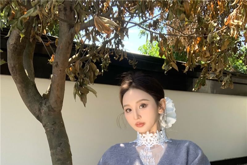 Long-Sleeve High Neck Lace Top / V-Neck Button-Up Cardigan / High Waist Shorts