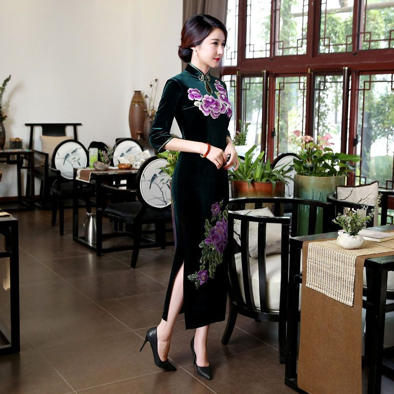 3/4-Sleeve Slit-Side Embroidered Cheongsam