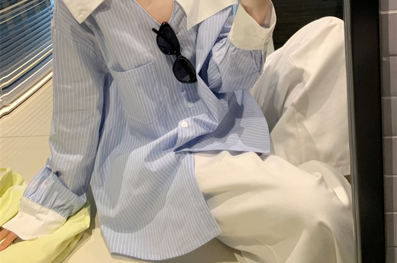 Long-Sleeve Cold Shoulder Striped Asymmetrical Button-Up Blouse