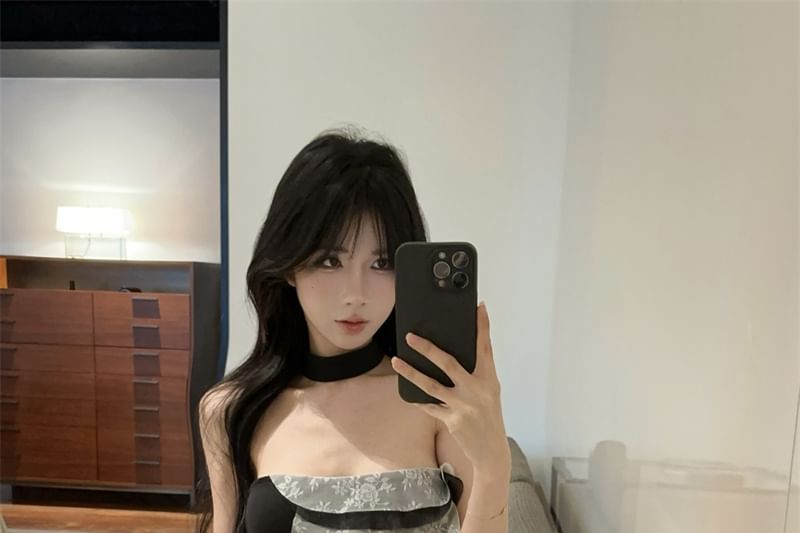 Strapless Asymmetrical Lace Panel Ruffle Slit Mini Dress