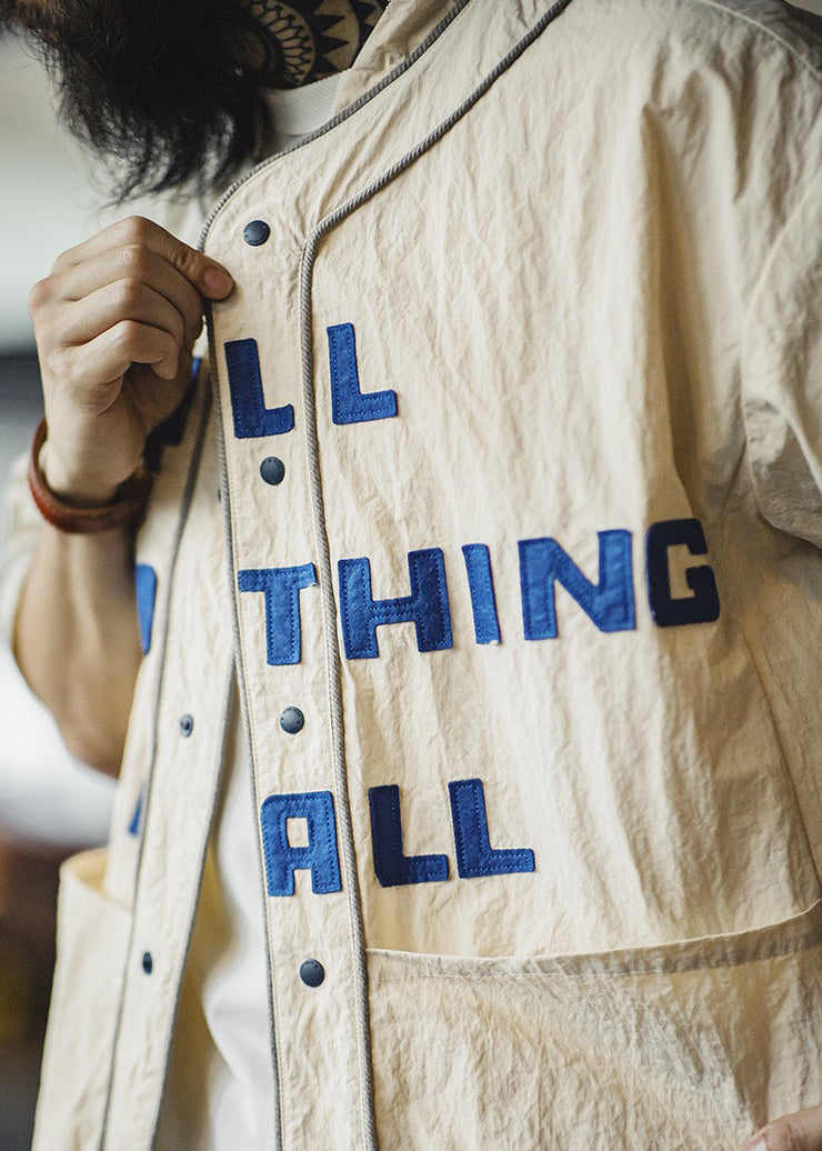 Plus Size Khaki Letter Button Pockets Cotton Men Shirts Half Sleeve