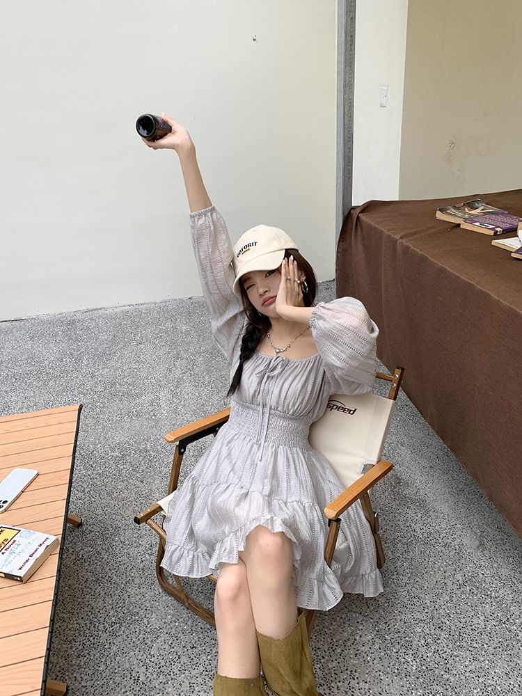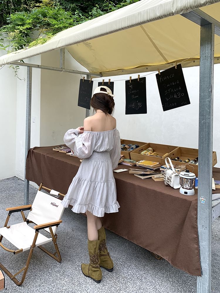 Puff-Sleeve Off-Shoulder Plain Mini A-Line Dress