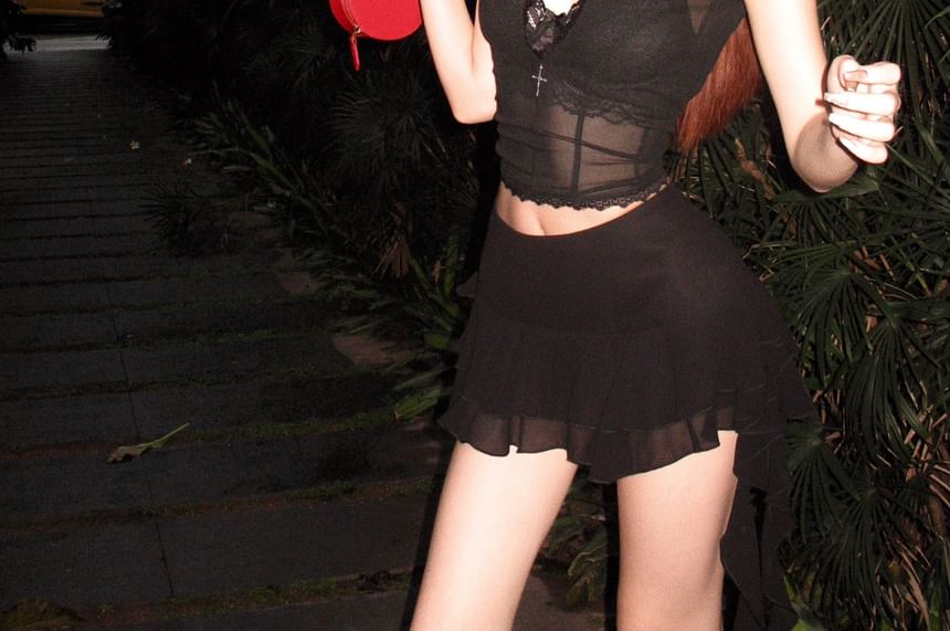 Puff-Sleeve Stand Collar Crop Lace Blouse / Mid Rise Mini A-Line Skirt / Lace Bra