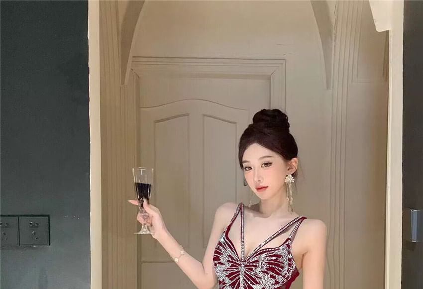 Rhinestone Gown Slit Butterfly Spaghetti Strap Evening Velvet Back Open V-Neck Mermaid
