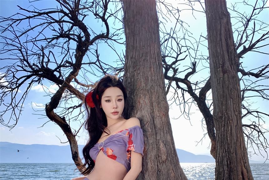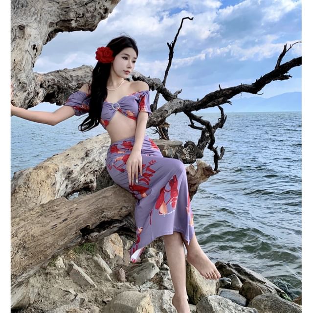 Set: Short-Sleeve Off-Shoulder Floral Crop Top + Mid Rise Maxi Pencil Skirt