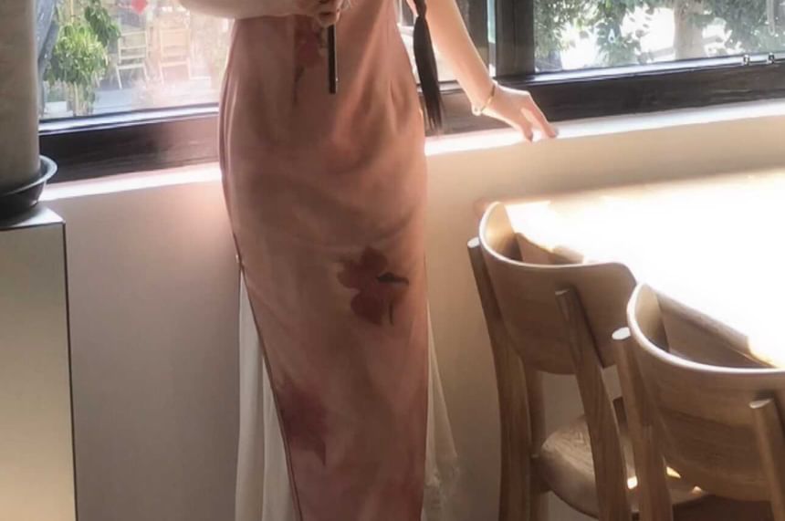 Short Sleeve Mandarin Collar Floral Print Midi Qipao